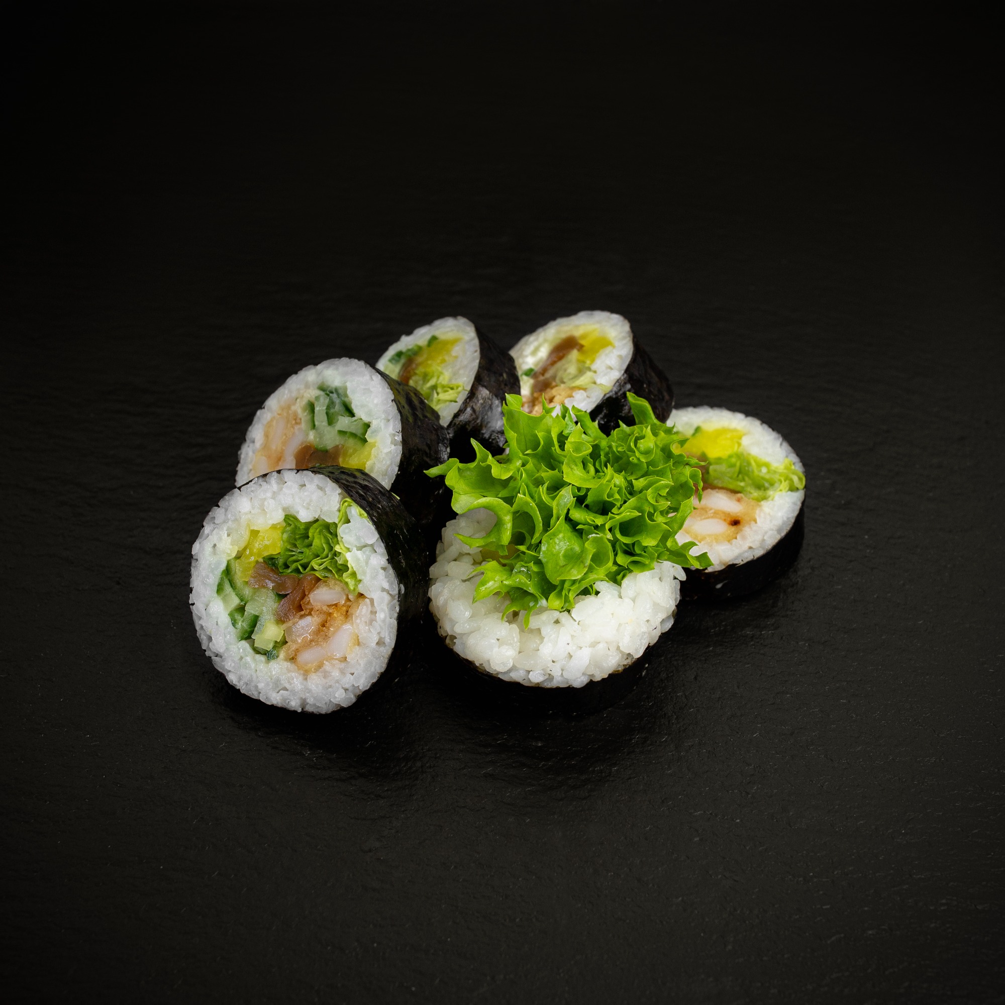 6x futomaki krewetka w tempurze (krewetka w tempurze, ogórek, oshinko, kanpyo, majonez)