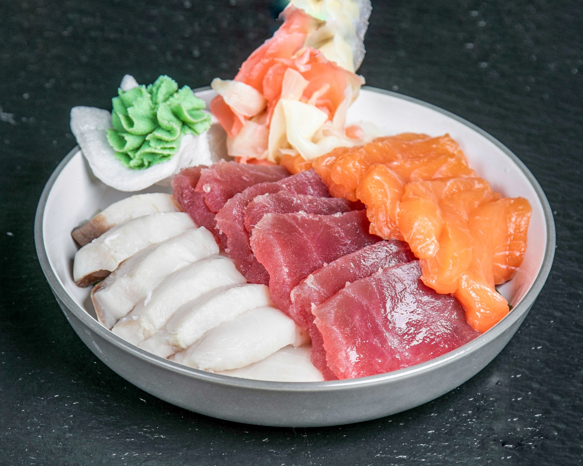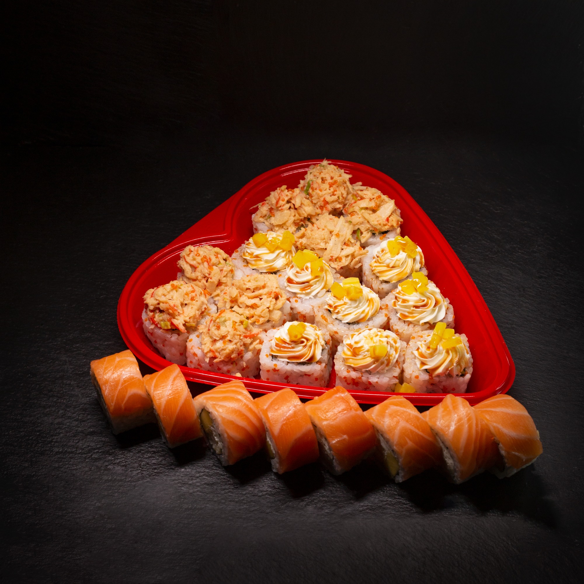 8x California z sałatką surimi(sałtka z surimi,tobiko,por,majonez,sos Sriracha,serek,wakame goma),8x California z pieczonym łososiem(łosoś pieczony,serek,awokado,tobiko,oshinko),8x California Gold z łososiem(łosoś,krewetka w tempurze,serek,mango)