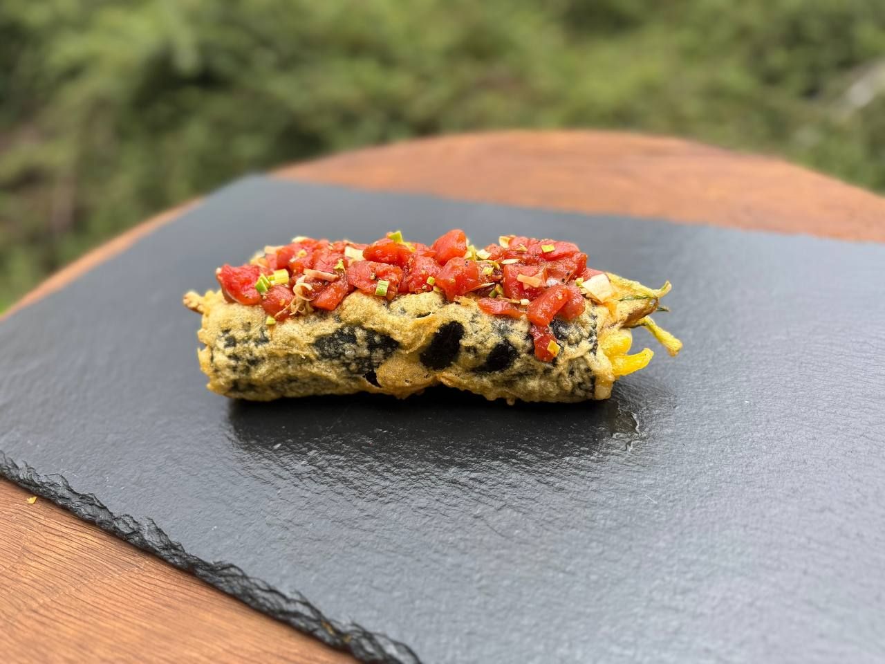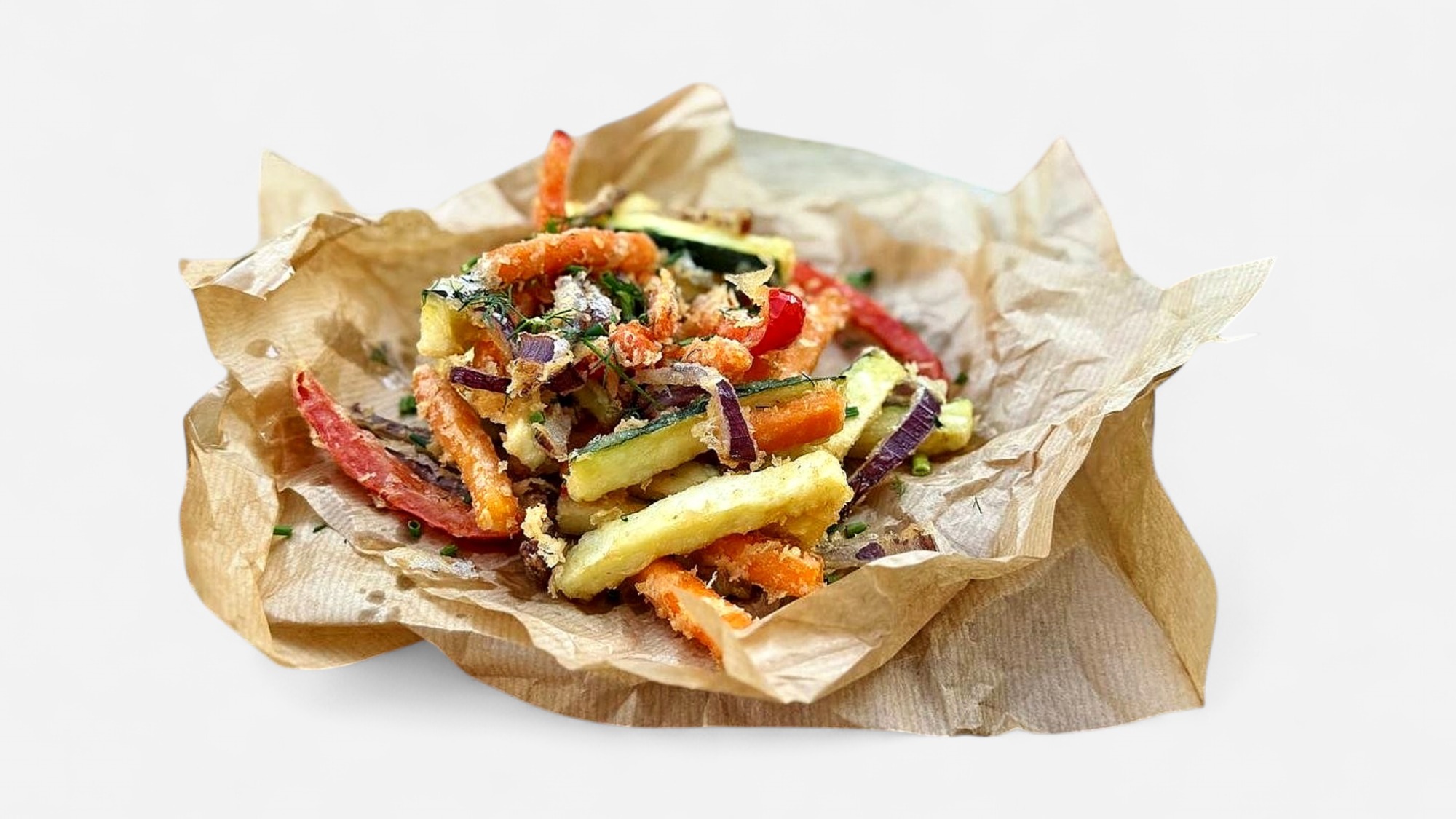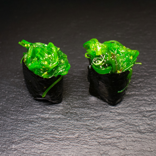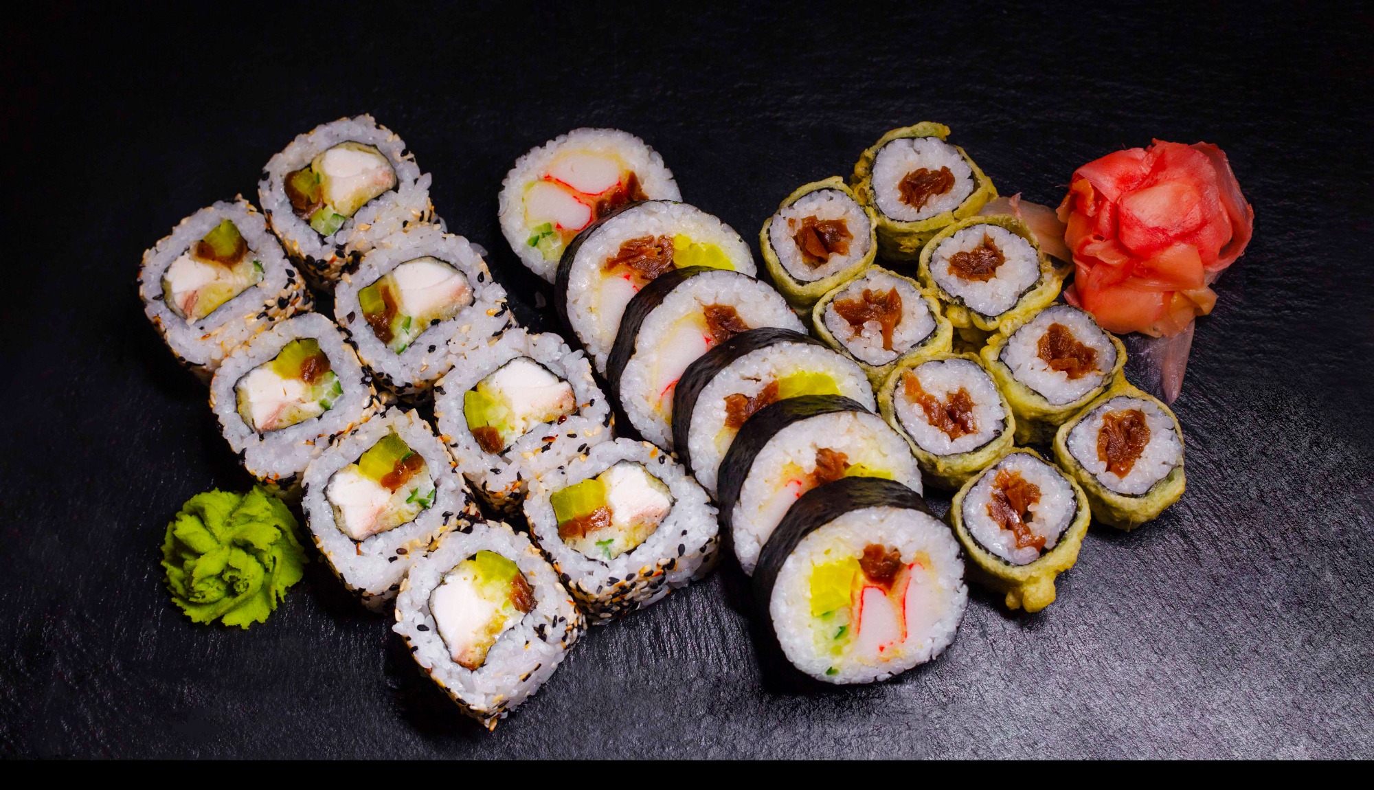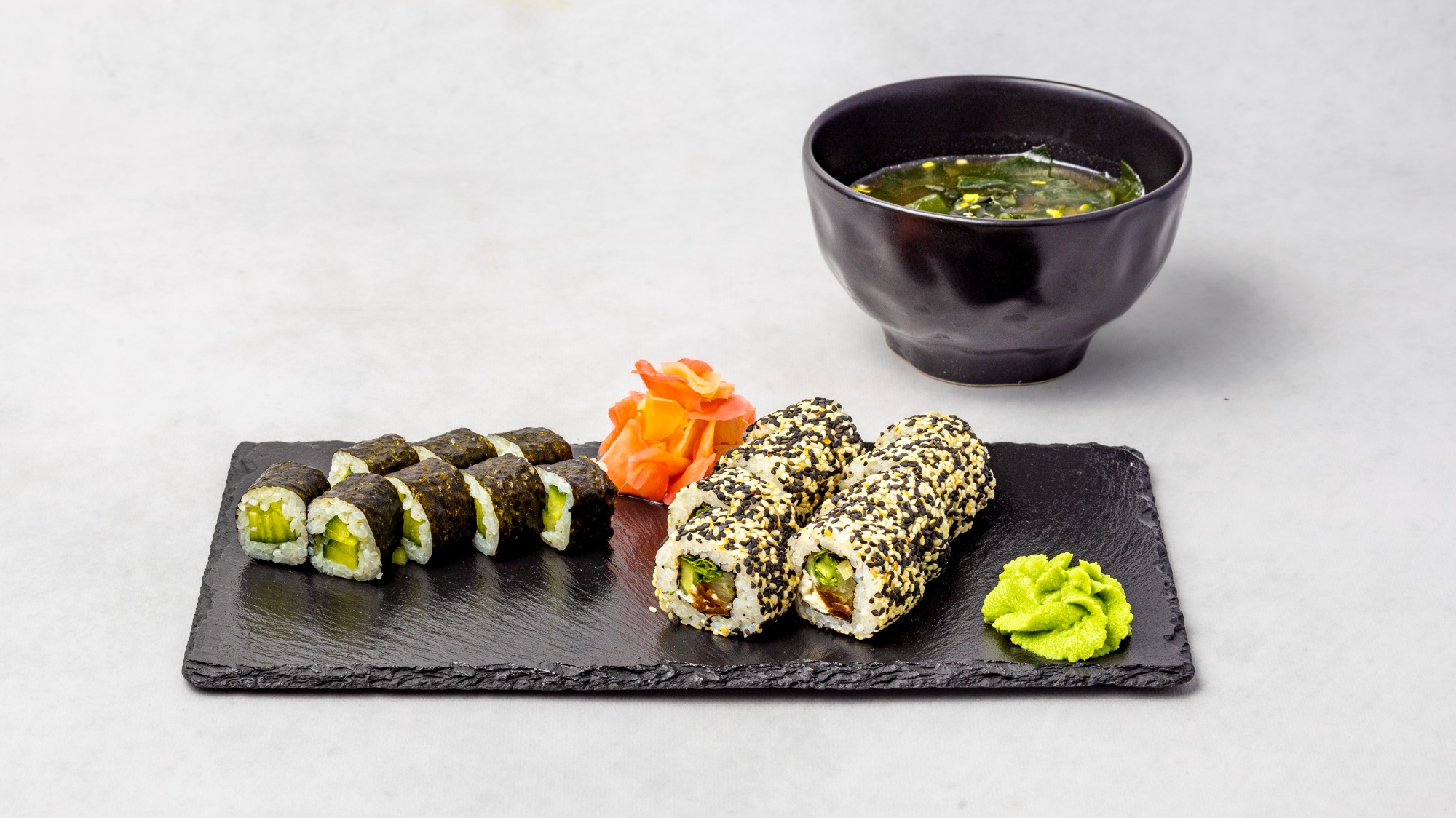 8x California Vege w papierze sojowym(ogórek,awokado,oshinko,sałata,majonez vege z trufflem),6x Futomaki z tofu w tempurze(tofu w tempurze,ogórek,awokado,sałata,sos sweet chilli),2x Gunkan wakame gome