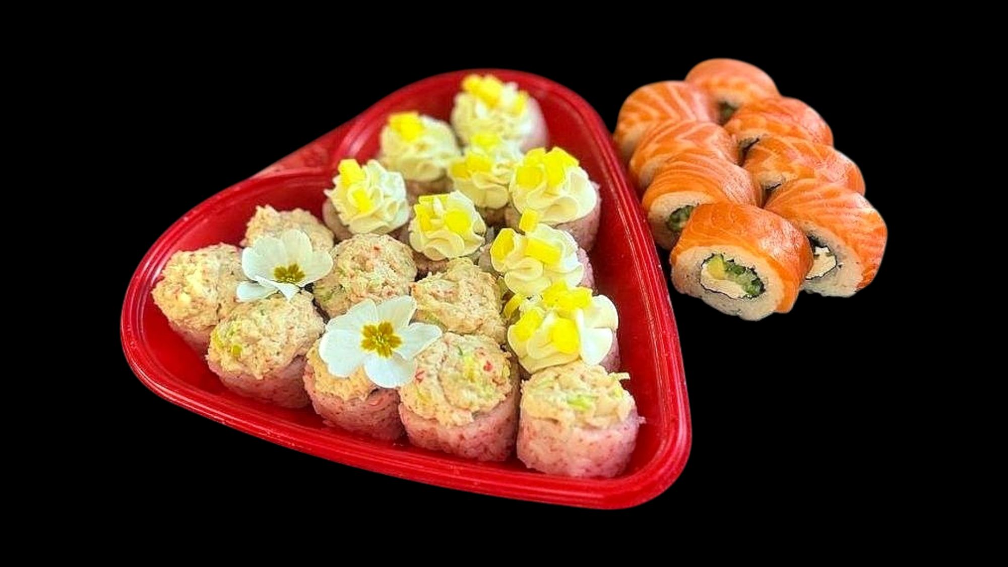 8× California z sałatką surimi z kawiorem (sałatka z surimi, tobiko, por, majonez, sos Sriracha, serek, wakame goma), 8× California z pieczonym łososiem (łosoś pieczony, serek, awokado, tobiko, oshinko). Opakowanie